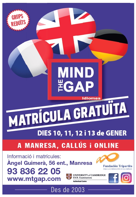 Ja tenim oberta la matrícula pel curs 24-25 Us oferim: classes al centre de Manresa (C/ Àngel Guimerà, 56) classes al centre de Callús (Passeig Anselm Clavé, 5) classes in-company (empreses, a domicili) classes extraescolars a escoles del Bages classes on-line Do you mindthegap? ...